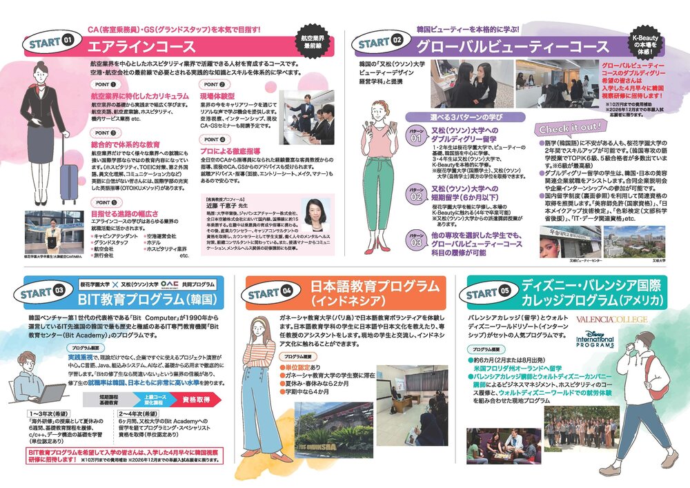 桜花学園大学 国際学部では、2027年度より皆さんの「学びのデザイン」をさらに広げる、新しい教育プログラムが次々と始まります。 韓国、アメリカ、インドネシア、そして日本国内。自分の「好き」を極め、世界や社会で活躍するための新しいステージをご紹介します。