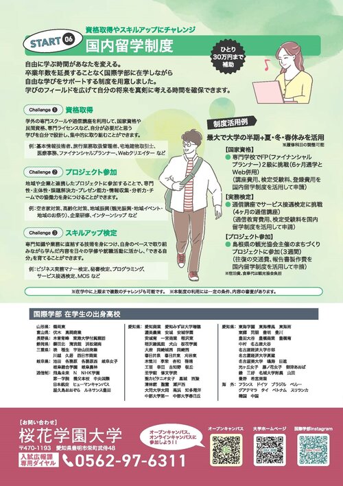 「やりたい学びを自分で設計する」ためのサポート制度です。 資格取得(FP、宅建、ITなど)や専門校での学修、地域貢献プロジェクトへの参加費用を大学がバックアップします。
