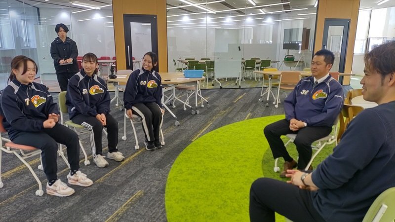 写真説明:手前左から佐藤穂花さん(教育保育学科3年・刈谷北高校出身)、尾関紗穂さん(教育保育学科1年、木曽川高校出身)、木下瑠優さん(教育保育学科3年・一宮商業高校出身)、葛谷監督、三好氏