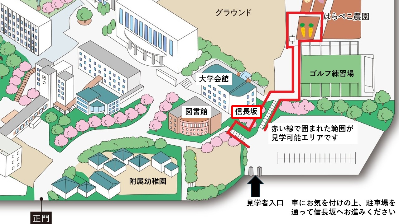 桜花学園大学・名古屋短期大学のキャンパスは、豊明市と名古屋市に各々所在する2か所の桶狭間古戦場公園の中間の丘陵に横たわっております。